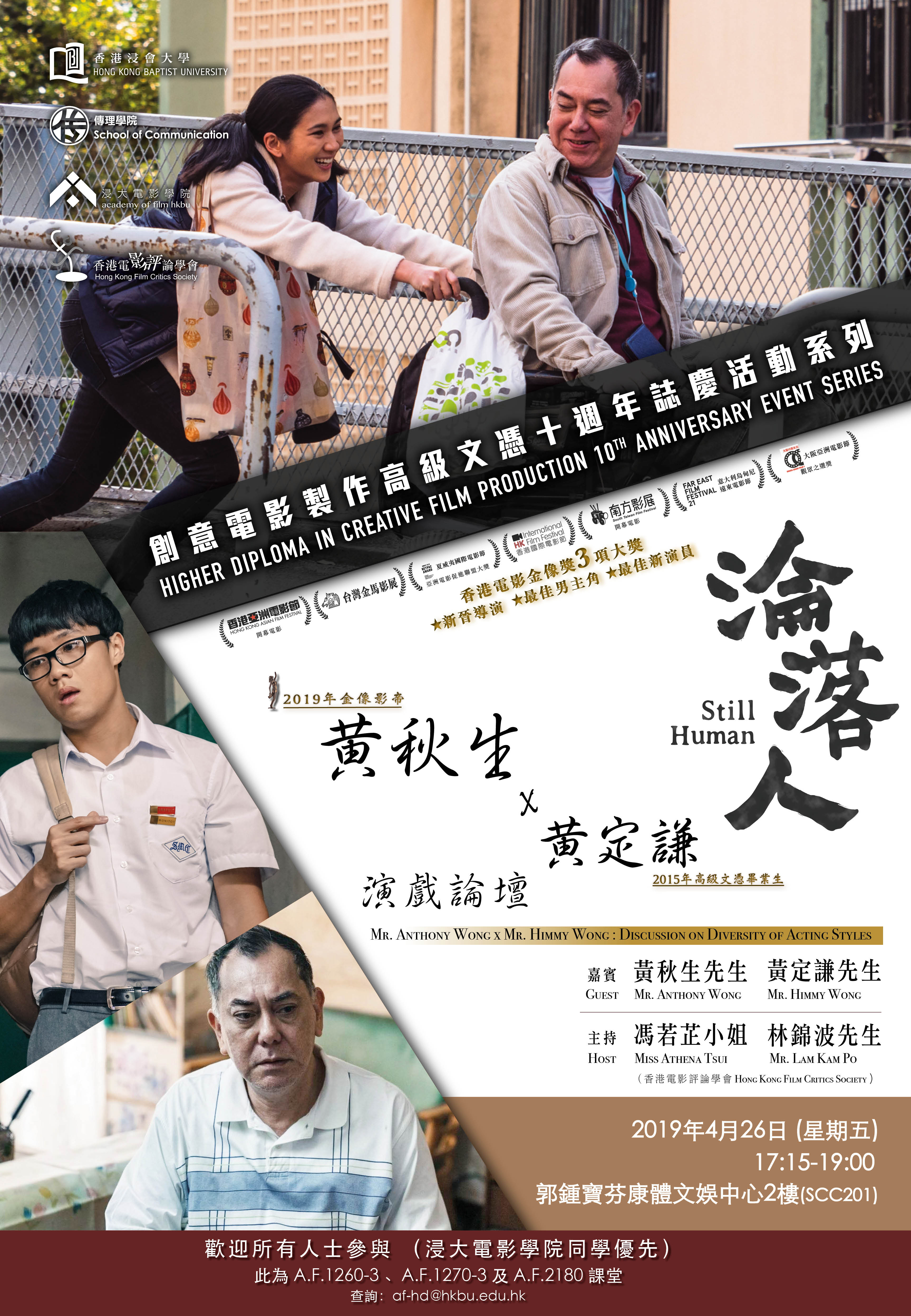 黃秋生 Anthony Wong - 演員 黃定謙 Himmy Wong - 演員/校友 馮若芷 Athena Tsui - 影評人 / 香港電影評論學會 林錦波 Lam Kam Po - 影評人 / 香港電影評論學會 |