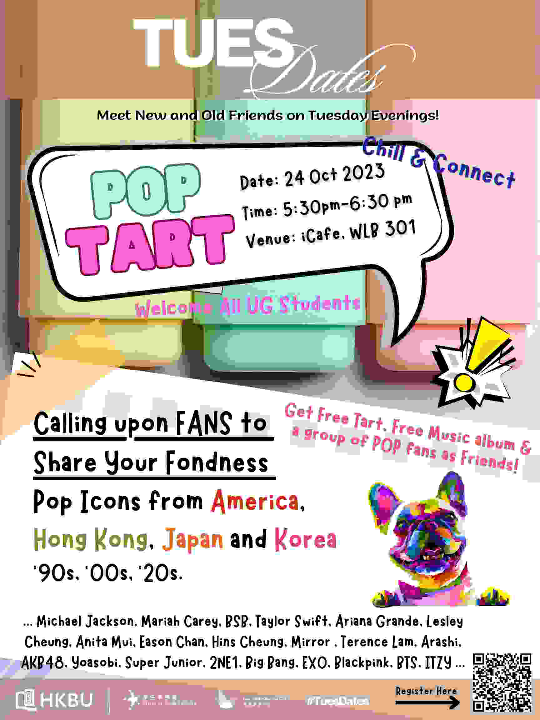A tart, made with flour and eggs, is available around the world in different flavors. Likewise, pop- culture around the world shares similarities and differences. We are calling upon FANS to share their fondness towards pop icons from America, Hong Kong, Japan, and Korea in the '90s, '00s, and '20s. After the session, you will get a tart, a free music album, and a group of pop fans as friends!