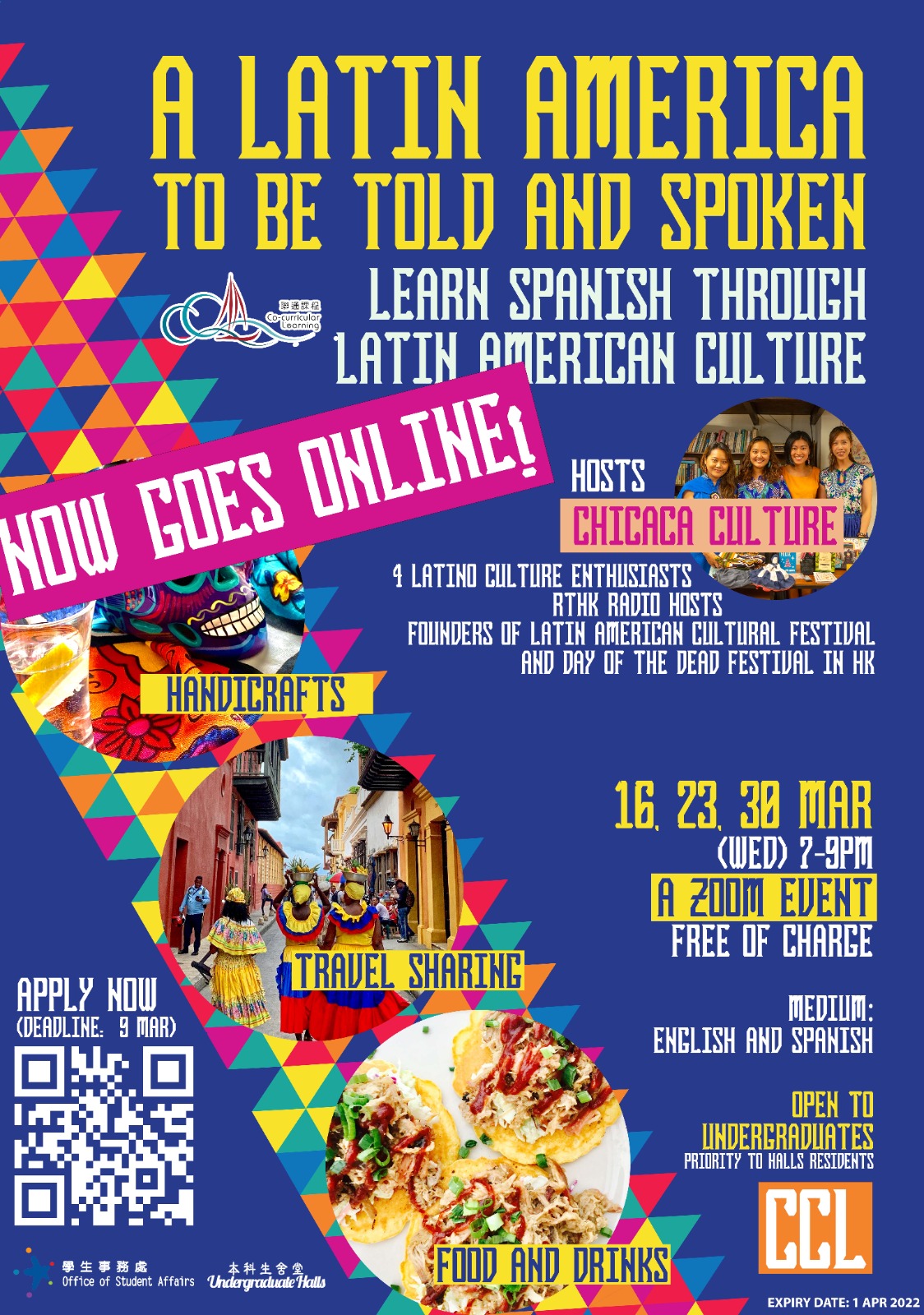 This ZOOM course is designed to teach beginner level’s Spanish with a series of interactive activities. Students will be able to get a taste of Latin America’s language and cultural richness through 3 distinctively themed sessions covering travel sharing of Colombia, handicrafts, and food & drinks.