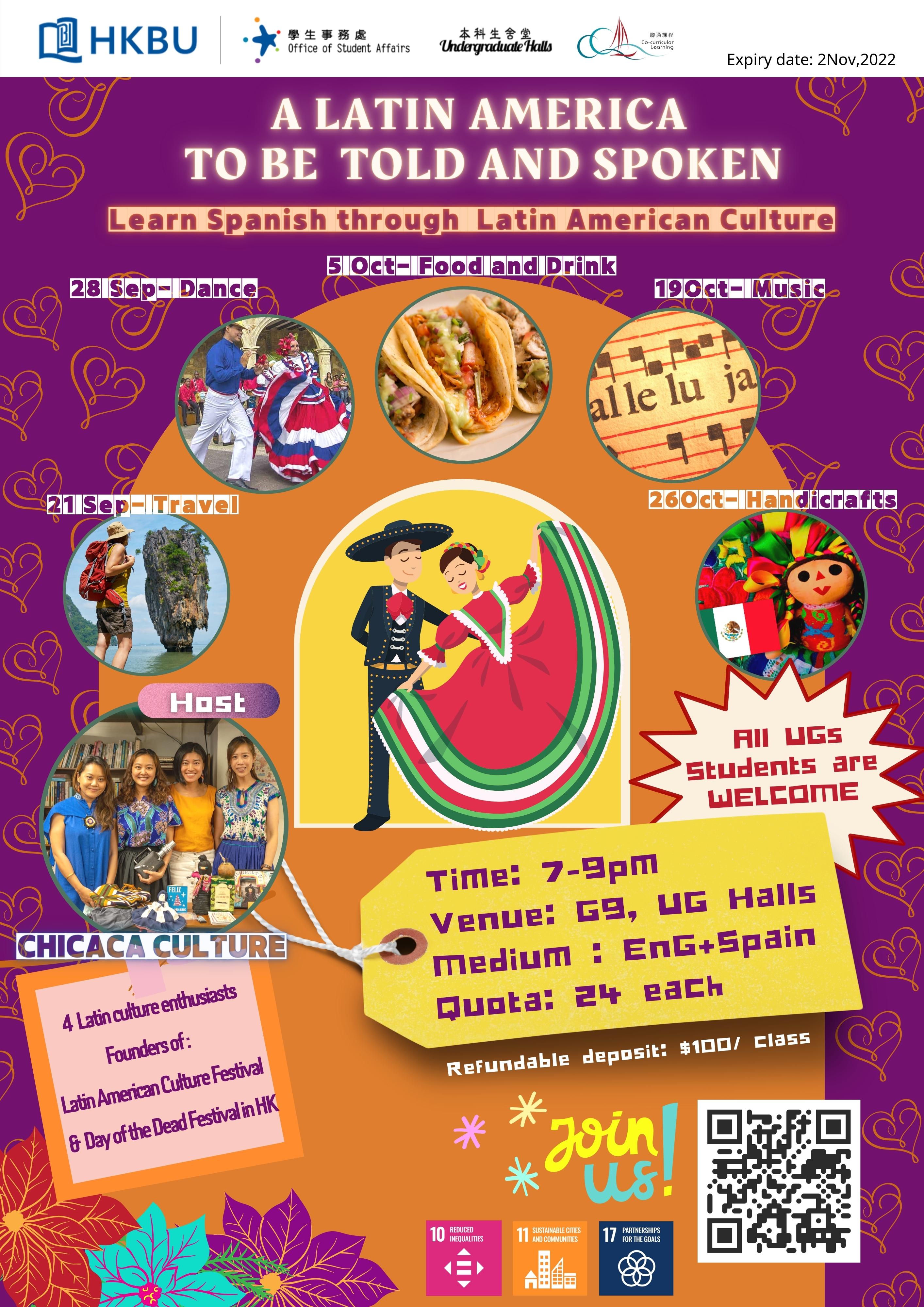 Time: 7:30 pm - 9:30 pmMedium of instruction: English and SpanishHost: Chicaca Culture - a group formed by 4 enthusiasts who are dedicated to promoting Spanish and Latin American culture in Hong Kong. They have recently produced an RTHK radio programme, which explores the stories of Hong Kong-based Latinos, as well as a 3-day Latin American Cultural Festival and a 2-week Day of the Dead Festival in Hong Kong.