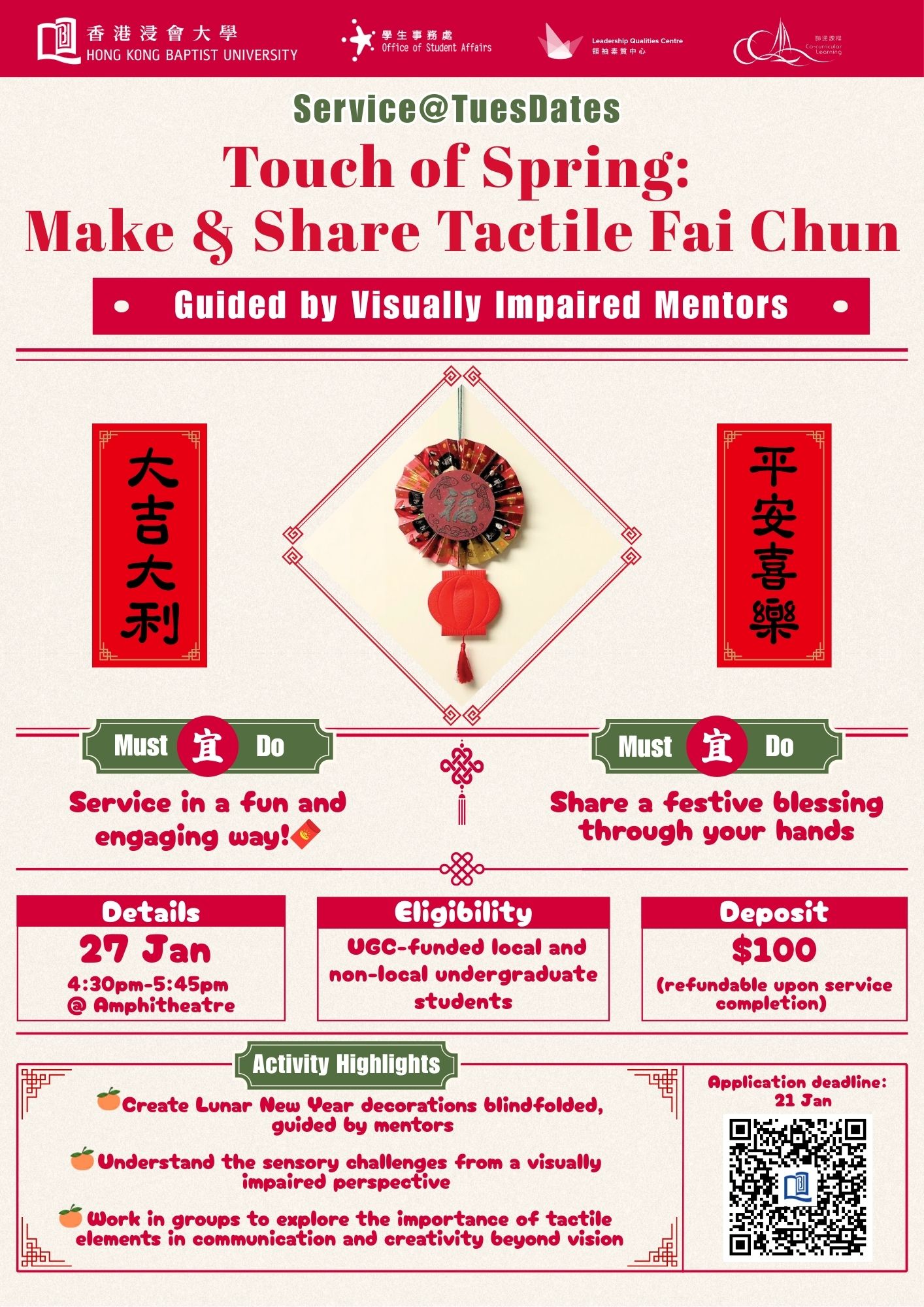 Join us in a Lunar New Year workshop featuring the making of Fai Chun ( 揮春 ) and festive decorations led by visually impaired mentors.